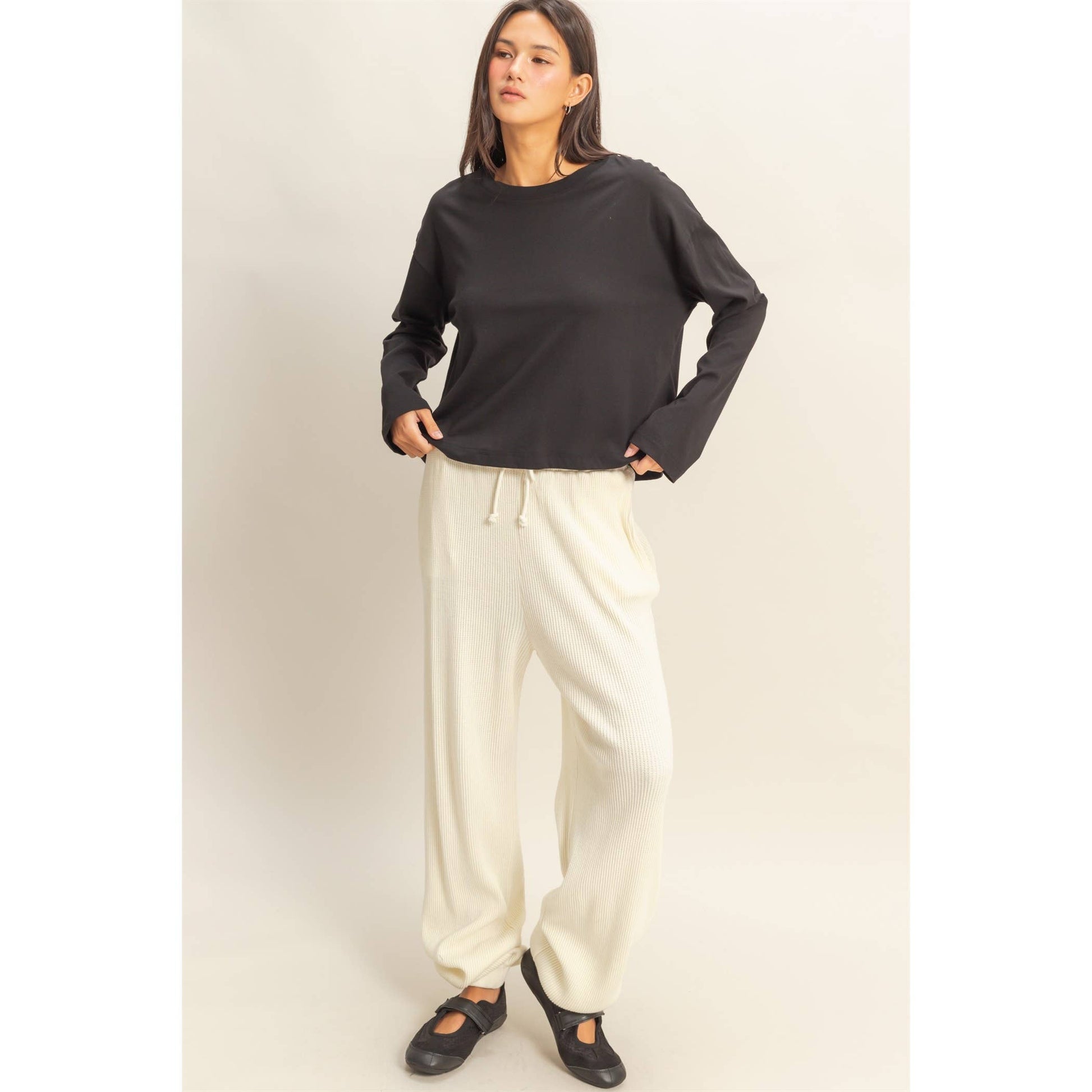 Effortless, Chic And Casual, It Is Featured With A Crew Neck, Long Wide Sleeves And A Boxy-Fit Silhouette For That Laid-Back Look at Cottage Beach. Oh, And The Drop Shoulders Add Up To The Style.